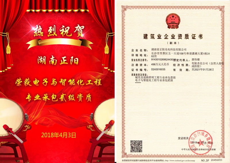 2018年4月3日,經(jīng)湖南省住房和城鄉(xiāng)建設(shè)廳批準(zhǔn),湖南正陽(yáng)獲得“電子與智能化工程專(zhuān)業(yè)承包貳級(jí)資質(zhì)”證書(shū)。