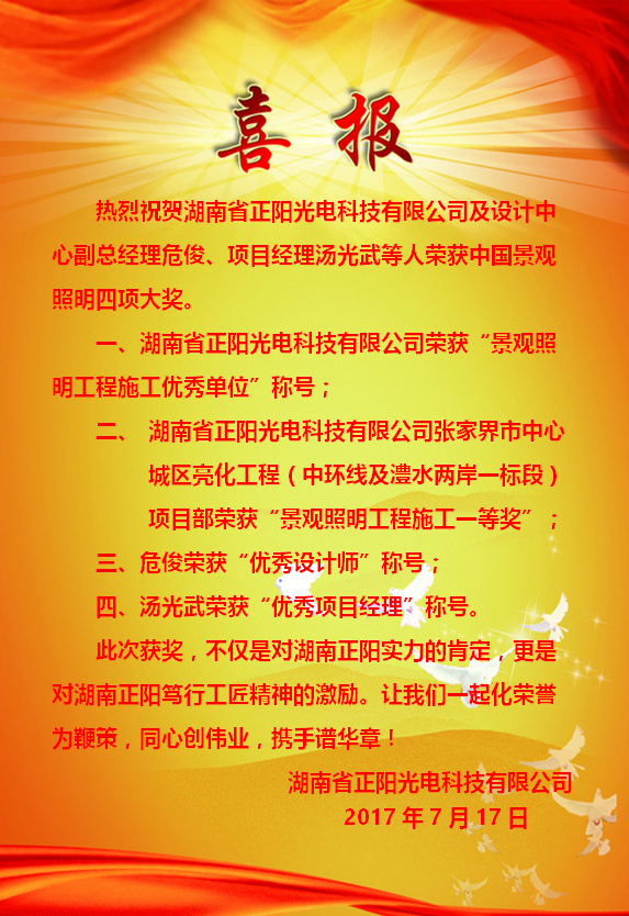 熱烈祝賀湖南省正陽光電科技有限公司及設(shè)計中心副總經(jīng)理???、項目經(jīng)理湯光武等人榮獲中國景觀照明四項大獎!